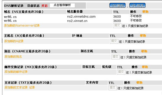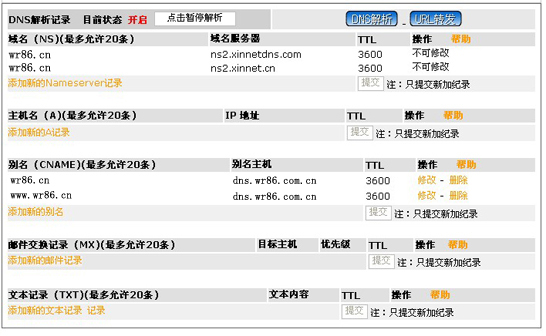 这样,域名解析部分就结束了,如果您的虚拟主机是在本站购买的,那么您只用在虚拟主机管理里绑定域名http://www.wr86.cn,您就可以马上通过www.wr86.cn或者wr86.cn进行访问了,如果您的虚拟主机不是在本站购买的,那么,请通知虚拟主机提供商进行绑定。