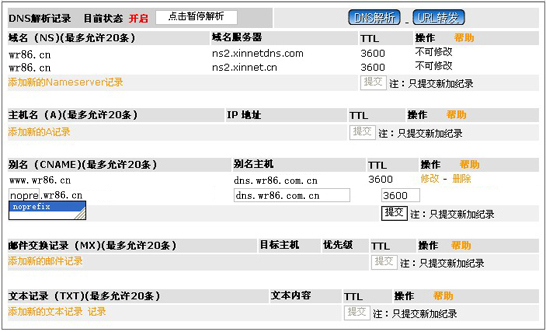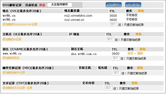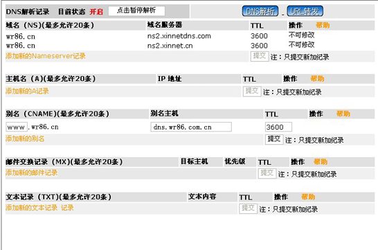 现以域名wr86.cn为例,把域名www.wr86.cn以及wr86.cn解析到虚拟主机上(假设虚拟主机的别名地址为dns.wr86.com.cn),解析完成后,您将可以用www.wr86.cn以及wr86.cn来访问您的网站,当然(解析完成后,还得在虚拟主机上绑定才会生效,本站的虚拟主机完全具备域名自主绑定功能)。