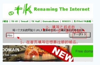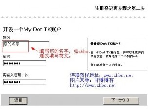如注册“zhbo.tk”域名,仅仅填写“zhbo”即可。然后点击“下一步”继续注册。